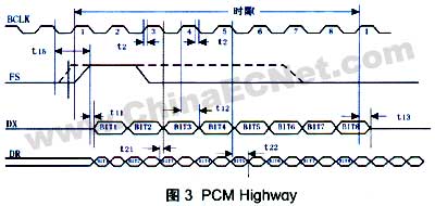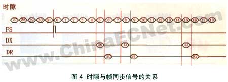 语音接口提供未压缩语音、传真数据的i/o通道。语音接口对外提供四根信号线pcmin、pcmout、pcmclk、pcmfs构成pcm总线,直接连接外部codec芯片的pcm highway。pcmin输入从codec送来的pcm信号,ac4880xc-c内部的dsp按照相应标准压缩后从hpi口交给主系统cpu 处理。pcmout则相反,ac4880xc-c将主系统cpu送来的语音数据按照合适的标准解压缩,然后从pcmout口送到外部codec,codec经过数/模转换后恢复成语音信号再通过用户接口送给用户端。pcmclk提供2.048mhz的比特同步时钟,而pcmfs提供8khz的帧同步时钟。pcm主时钟(bclk)、帧同步时钟(fs)、接收数据(dr)和发送数据(dx)一起构成pcm highway信号,与ac4880xc-c进行连接。bclk与fs分别对应ac4880xc-c的pcmclk和pcmfs,这两个时钟信号都由ac4880xc-c 产生;dr和dx分别对应ac4880xc-c的pcmout和pcmin。pcm highway信号时序以及时隙与帧同步信号的关系分别如图3、图4所示。为了codec与dsp芯片间正确收发数据,一般选择codec芯片在bclk的上升沿发送数据dx,下降沿采样数据dr,而在另一端的ac4880xc-c,则在时钟下降沿采样pcmin,上升沿发送pcmout。
