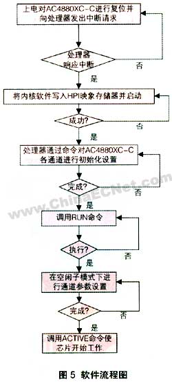 主要是基于嵌入式arm处理器,通过hpi接口实现对ac4880xc-c及相关芯片的读写操作。流程图如图5所示: